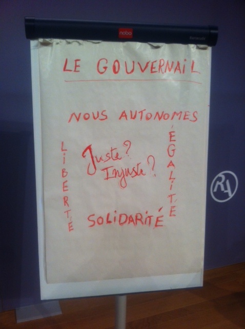 - Pour que cette citoyenneté soit effective, c’est le fonctionnement même de la démocratie qui est à réinvestir. Majo Hansotte propose alors une société à trois niveaux avec l’espace public comme lieu de réalisation de la citoyenneté. L’espace public citoyen est ainsi la source du pouvoir. Ce dernier est à considérer comme un « lieu vide » (C. Lefort), car la vie est indéterminée, en constante évolution, d’où la nécessité de se détacher d’éventuels déterminants de ce qui ferait le quotidien pour tendre vers une approche du juste et de l’injuste. Pour aider à cela, il existe le « gouvernail » (cf. photo) dont les piliers sont l’autonomie, la liberté, la solidarité et l’égalité. Cela donne l’opportunité de laisser s’exprimer la créativité de la citoyenneté. Néanmoins, pour y parvenir, il convient de recourir à certaines ressources langagières pour faire en « s’appropriant les propriétés et les communs de la vie ».