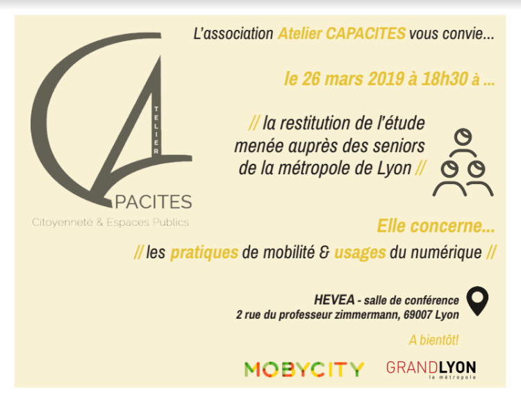 Depuis septembre 2018, l’équipe d’Atelier CAPACITES conduit une étude sur les pratiques de mobilité et usages du numérique des seniors (60 ans et plus) de la métropole de Lyon. L’association qui bénéficie, dans ce cadre, d’un soutien de la CFPPA (Conférence des Financeurs pour la Prévention de la Perte d’Autonomie), a effectué durant six mois une enquête par questionnaire sur l’ensemble du territoire métropolitain.
